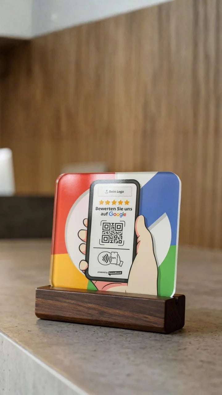 Via QR code or NFC — straight to your Google review page. No subscription, buy once, keep forever.