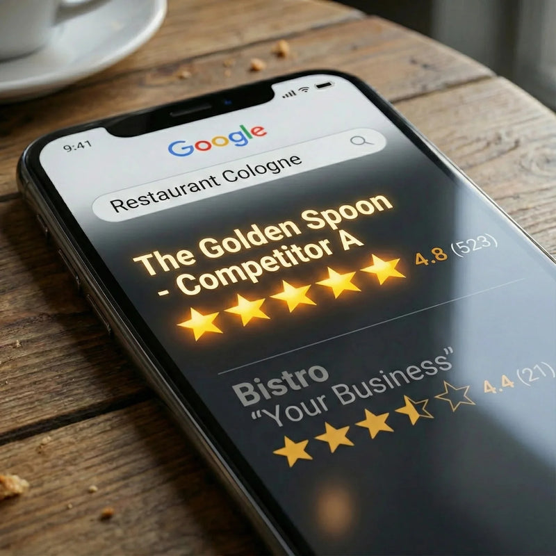 Weniger Bewertungen schaden deiner SEO. Wenn ein Konkurrent 4,8 Sterne hat und du bei 4,4 stehst, gibst du ihm buchstäblich Geld – noch bevor ein potenzieller Gast sich entschieden hat, wohin er geht.